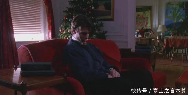 这是一次明确而严厉的拒绝:那不关我们的事。 在施尼茨勒的原著中,故事至此结束。当这对夫妻渐渐沉入一种令人安心的、「没有梦的睡眠」之中,留给我们的,是一连串尚未被彻底解答的思考:婚姻的关键,是否正在于如何平衡彼此可能冲突的驱力——一方面是对传统婚姻的信念,另一方面则是对婚姻之外情色欲望必然存在的理解;一方面相信「永远」,另一方面又清醒地意识到一切随时可能终结;既要彼此信任,同时也承认,人终究无法做到完全确定。 那把横亘其间的剑,终于被放下了。 而在《大开眼戒》中,库布里克却执意要让我们直面那个令人清醒的「第二天清晨」。影片以爱丽丝憔悴不堪的面容开场——她隔着房间凝视着比尔。在她那穿透性的目光之下,比尔已不再是那个穿着昂贵西装、医生白袍或租来的燕尾服的「比尔医生」。相反,他成了一个穿着节日毛衣的小男孩,蜷缩在一张比例失衡、显得异常巨大的沙发上,他在画面中被刻意缩小,宛如一个等待受罚的孩子。
